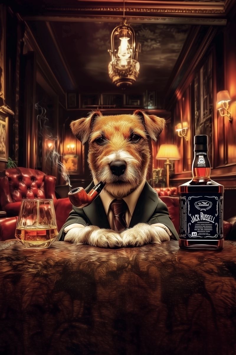 Quand l’élégance canine rencontre le whisky légendaire. Ce gentleman à quatre pattes fume la pipe avec classe, sirote un Jack comme un lord et te juge en silence depuis son pub anglais. Un costard, une gueule, et des poils : l’esprit very british dans toute sa splendeur. Interdit aux chats mal habillés.